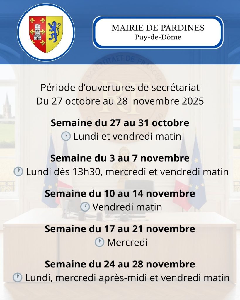Dans le cadre de la formation diplômante du secrétariat (préparation au passage en catégorie B – rédacteur territorial), les horaires de la mairie sont temporairement adaptés.